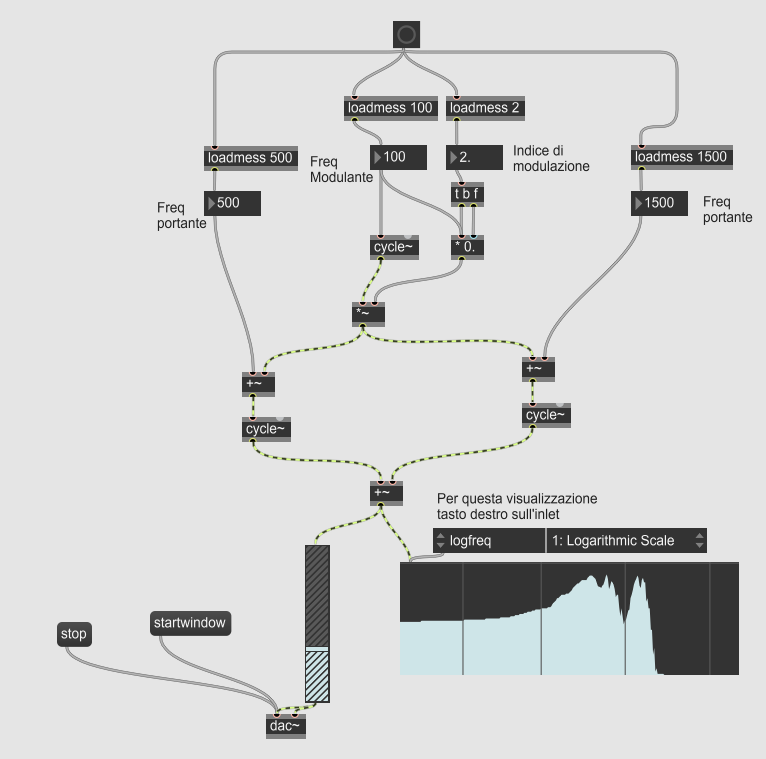 Creare una patch che realizzi un processo di sintesi FM con i seguenti parametri: frequenza modulante a 100 Hz, due portanti con frequenze di 500 e 1500 Hz, indice di modulazione 2 per entrambe le modulanti. Descrivere lo spettro risultante, motivando la risposta.