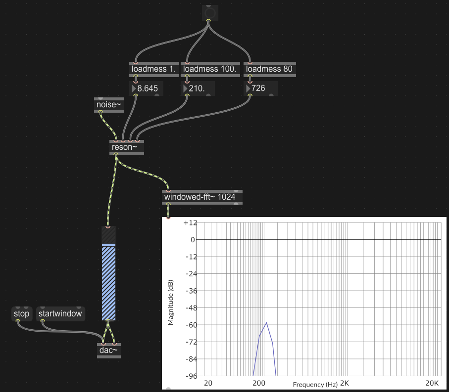 Costruire una patch contenente un generatore di rumore bianco collegato a un filtro risonante a banda stretta, tale che la qualità percepita del segnale risultante sia prossima a quella di una sinusoide leggermente “instabile”.