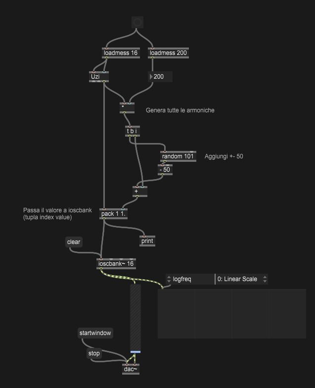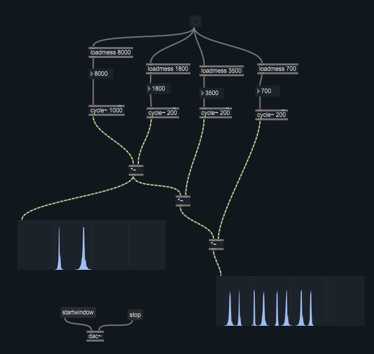 Programmare un patch nel quale viene prodotto un suono a 8 componenti a partire da sinusoidi sfruttando la tecnica della modulazione d’ampiezza (AM) o della modulazione ad anello (RM). Implementare anche una funzione che permetta di calcolare i valori delle frequenze delle 8 componenti