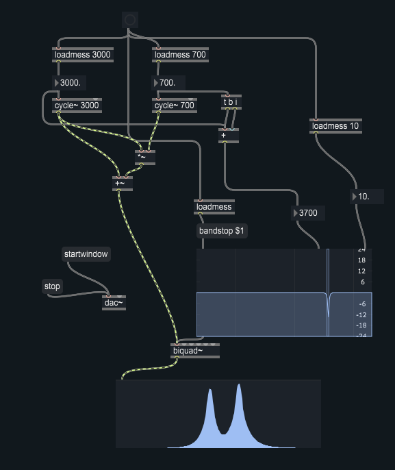 Programmare un patch in modo da filtrare in alternativa una delle due bande laterali di un un suono ottenuto da modulazione d’ampiezza tra un oscillatore sinusioidale con frequenza 3000 Hz ed un secondo oscillatore sinusoidale con frequenza 700 Hz.