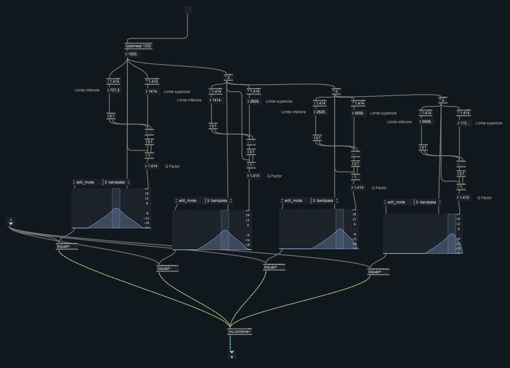 Programmare un patch in modo da calcolare a partire dal valore della frequenza centrale i valori delle frequenze estreme della banda di un filtro passa banda, la cui larghezza corrisponda a circa un’ottava. Calcolare anche il fattore Q.
